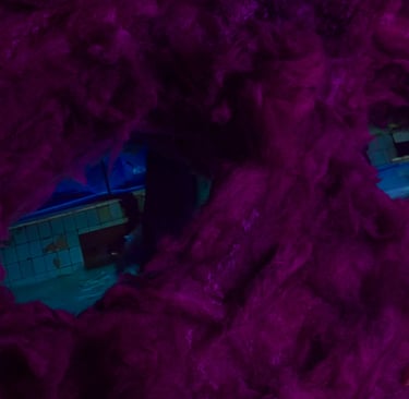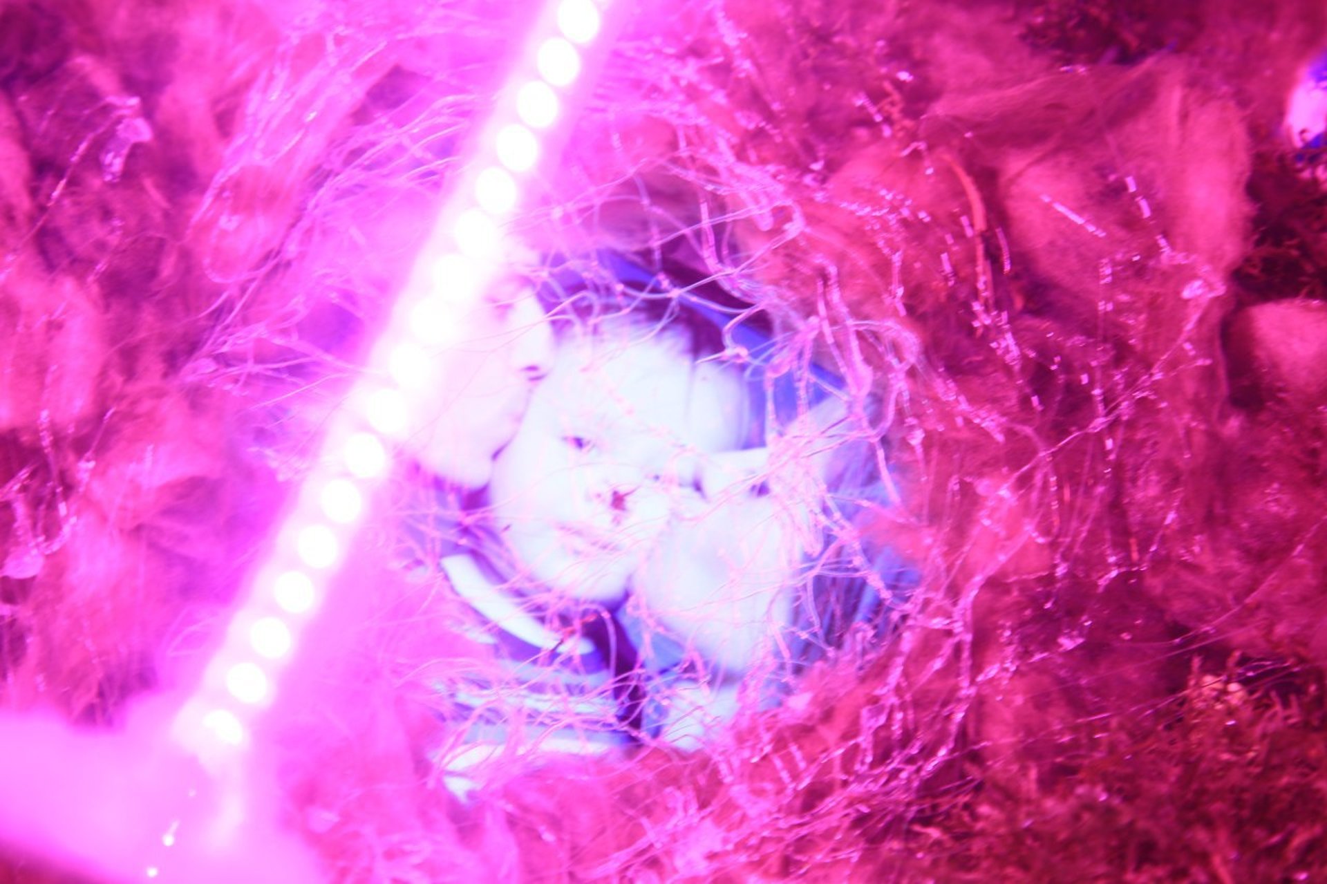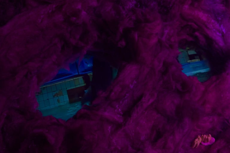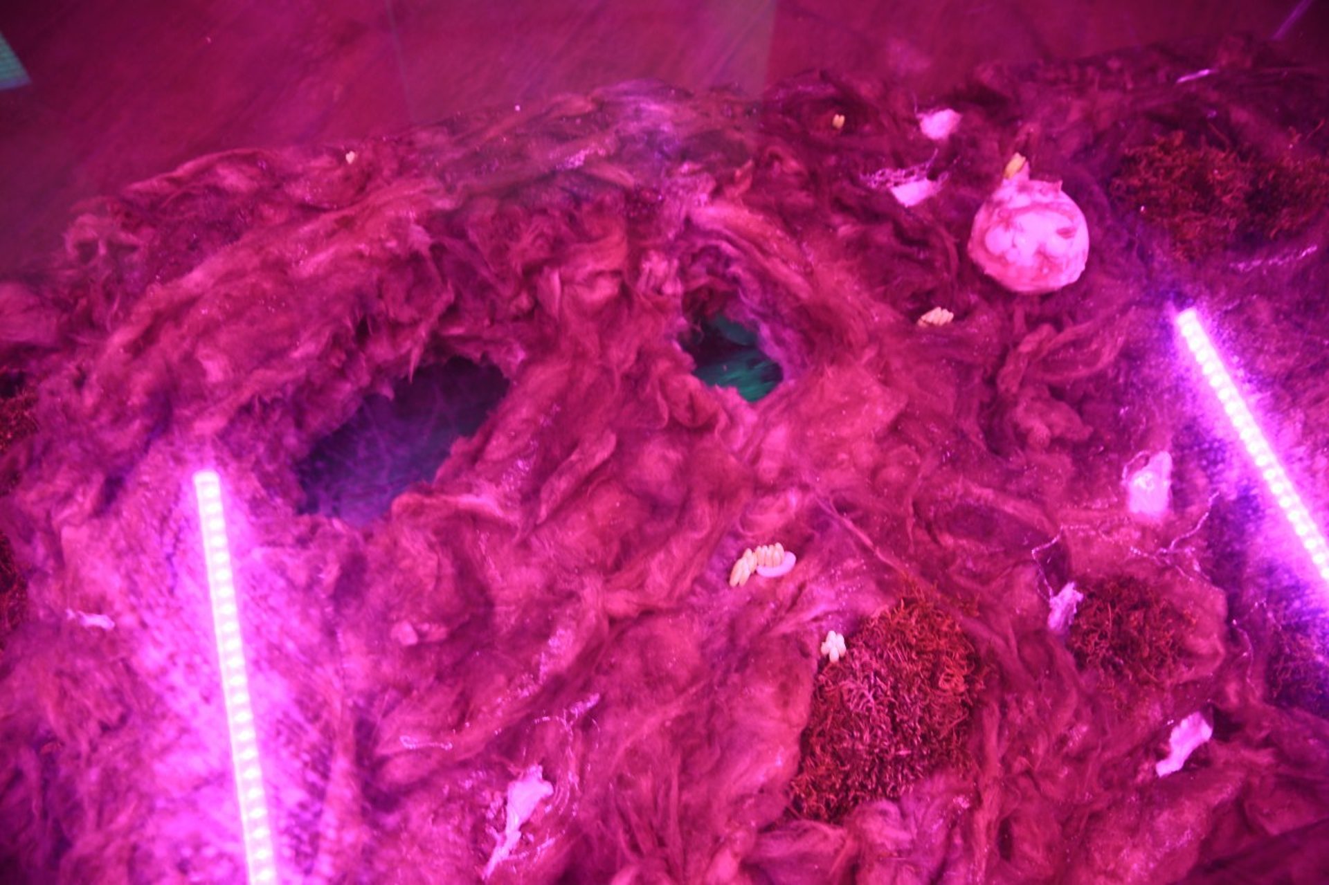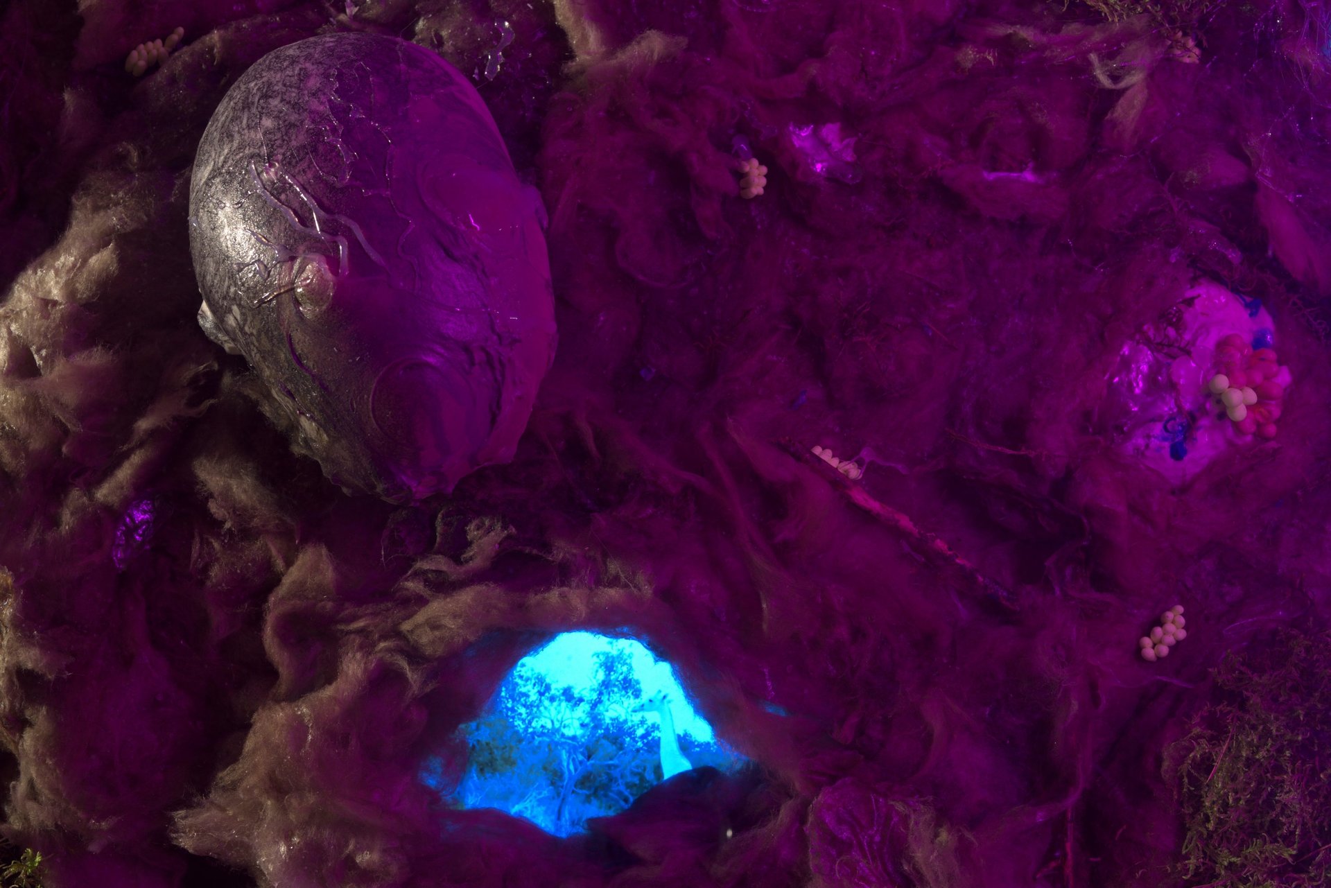 In the space, mutually exclusive images are hallucinatorily combined: karaoke-mass, grow lights for plant growth, organic remains of cotton, ruined wool inhabited by mucous bald patches, the insides of these ruins — digital images: stock photographs of a family, extinct white giraffes, amateur videos from a dolphinarium, fill and swarm like maggots inside the body of these tomb-like objects.