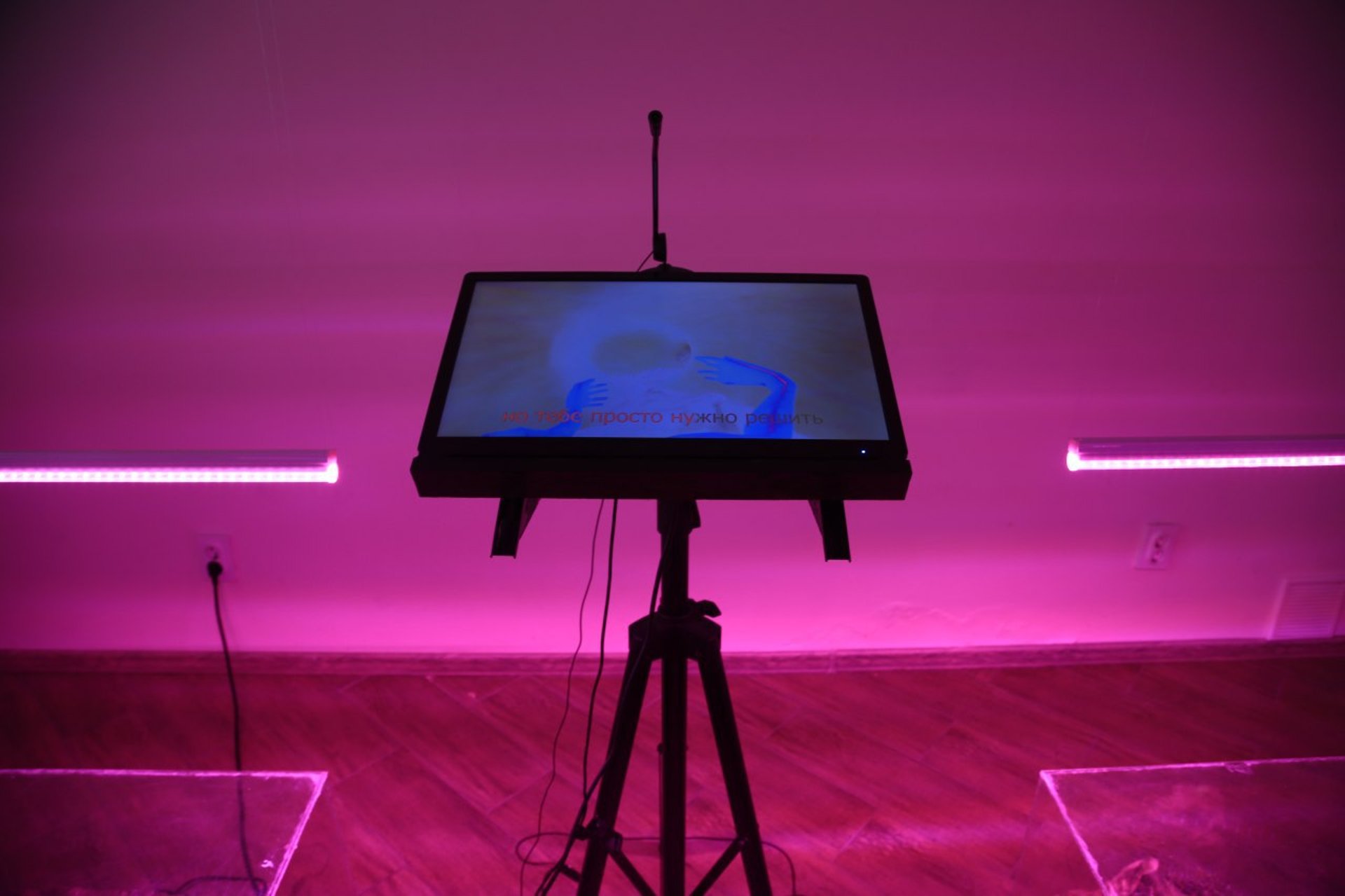 In the center of the space there is a stand with a microphone and a screen on which karaoke is running. The visitor can take the place of the missing element and try on the role of a servant of the mass or a medium calling spirits to life. This empty place is itself ghostological. In its usual conception, hauntology considers the future that did not arrive: utopian models of the world that, for some reason, did not pass the test of reality and remained in another world coexisting with ours as ghosts. In this work, this concept is played out from the side of the possibility of this experience, the possibility of occupying a nonexistent place, giving voice to ghosts, letting them grow, connecting to them on their own territory.