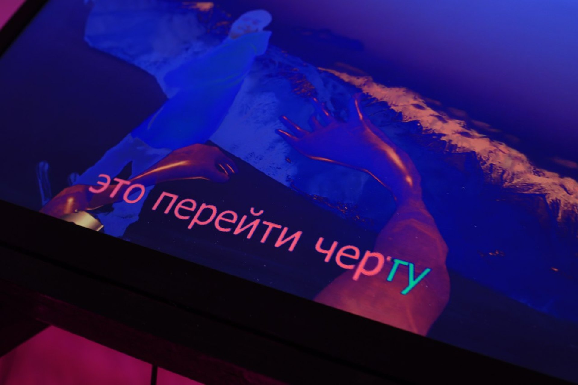 The subtitles for the karaoke — a text of the popular song Bruno Mars – “The Other Side,” translated through Google Translate, with a strongly slowed instrumental track — create a situation in which it is impossible to sing the slowly moving words on the screen. Only in a situation of impossibility do the conditions for performing the song open through faith. This is very similar to the situation of perceiving art, a situation in which it is necessary to step out of one’s habitual coordinates toward another (world), a place where all coordinates shift their degree. The viewer is invited to sing, invited to believe in art, but always at the cost of stepping out of one’s body, at the cost of pure faith — irrational and promising nothing.