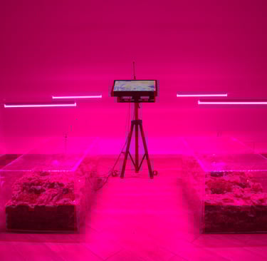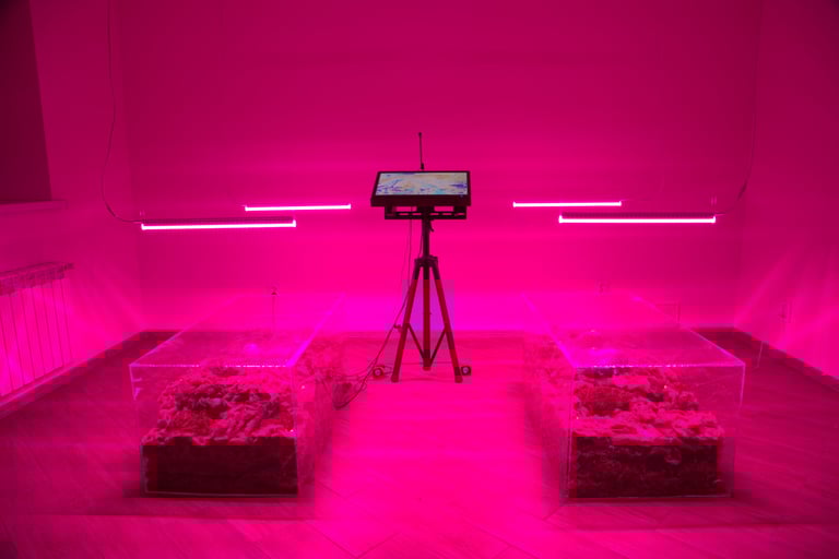 Entering a symmetrically organized space with a violet glow from grow lights and bright green light coming through the windows, one finds oneself in a place for a séance, where contact between the material and the immaterial, the living and the dead takes place. Where one can try to establish a connection with a ghost through karaoke.